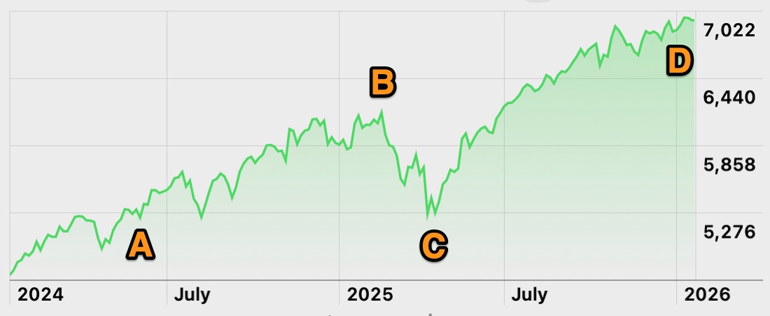 I started my investments in 2024, marked A. By early 2025, at point B, I’d had returns of around £250 which was better than my cash ISA with a 5% gain. After the US announced tarrifs for foreign imports, the market lost value quickly. I did hold out for a while, but then did what you’re not supposed to do and panicked. I asked the bank to sell all of my investments and it took them a few days to do so, meaning I sold at point C, the very worst time to sell it can now be seen. After the US softened their tarrif rules, the market started recovering quickly but I was not realising any of those gains. If I hadn’t panicked and left my investments in place, I would have seen gains reaching £500 by the end of 2025 at point D.